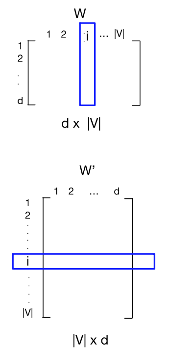输入 \(v_i\) 的嵌入是 \(W\) 的第 \(i\) 列;词 \(i\) 的输出 \(v'\) 的嵌入是 \(W'\) 的第 \(i\) 行。